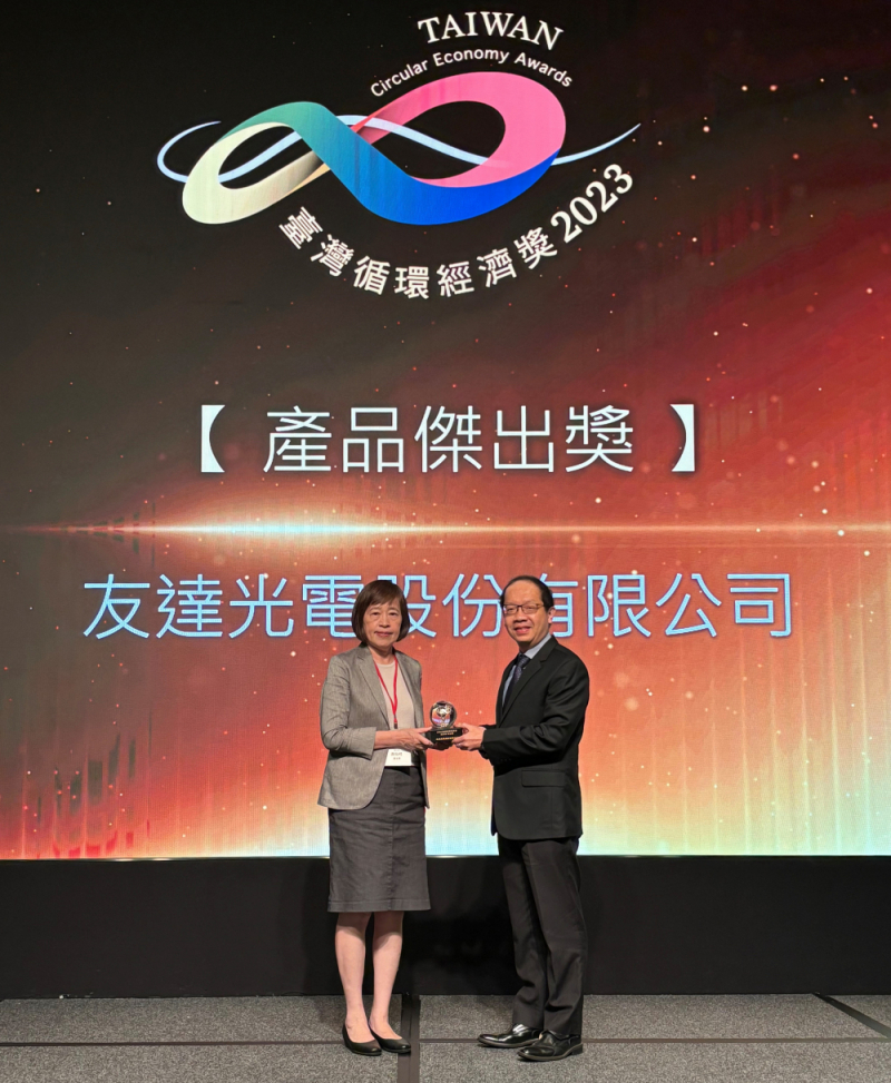 友達光電響應聯合國永續發展目標(Sustainable Development Goals, SDGs),依循SDG 12「責任消費與生產」制度,致力推動綠色製造、擴大循環經濟影響力,對內從循環產品之設計販售、製程原料回收、廢棄物減量等面向著手,對外與合作夥伴共同推動包材回收、研發再生料技術及製程材料循環,落實綠色製造與資源循環利用,在本年度台灣循環經濟獎之產品傑出獎肯定。台灣循環經濟獎係由中華經濟研究院設立之獎項,旨在鼓勵各界積極投入循環經濟,友達以優異之循環經濟成果,自首屆起連年締造佳績,展現企業落實循環經濟的價值。