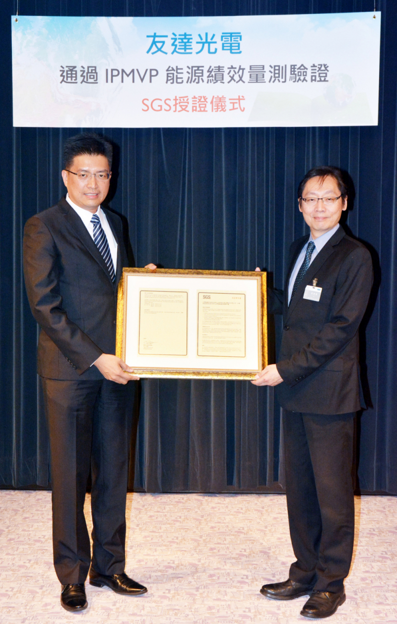 友達取得全台第一張 IPMVP 能源績效驗證,由 SGS 台灣資深總監鮑柏宇 (右)、友達製造營運群副總經理林挺立 (左)進行授證儀式。